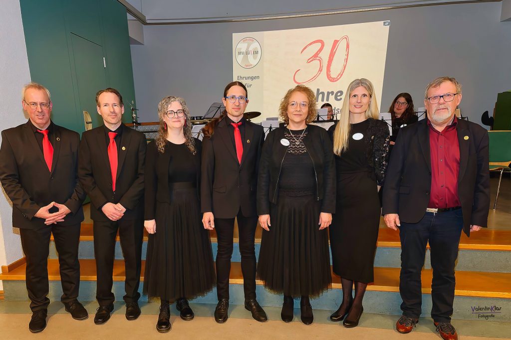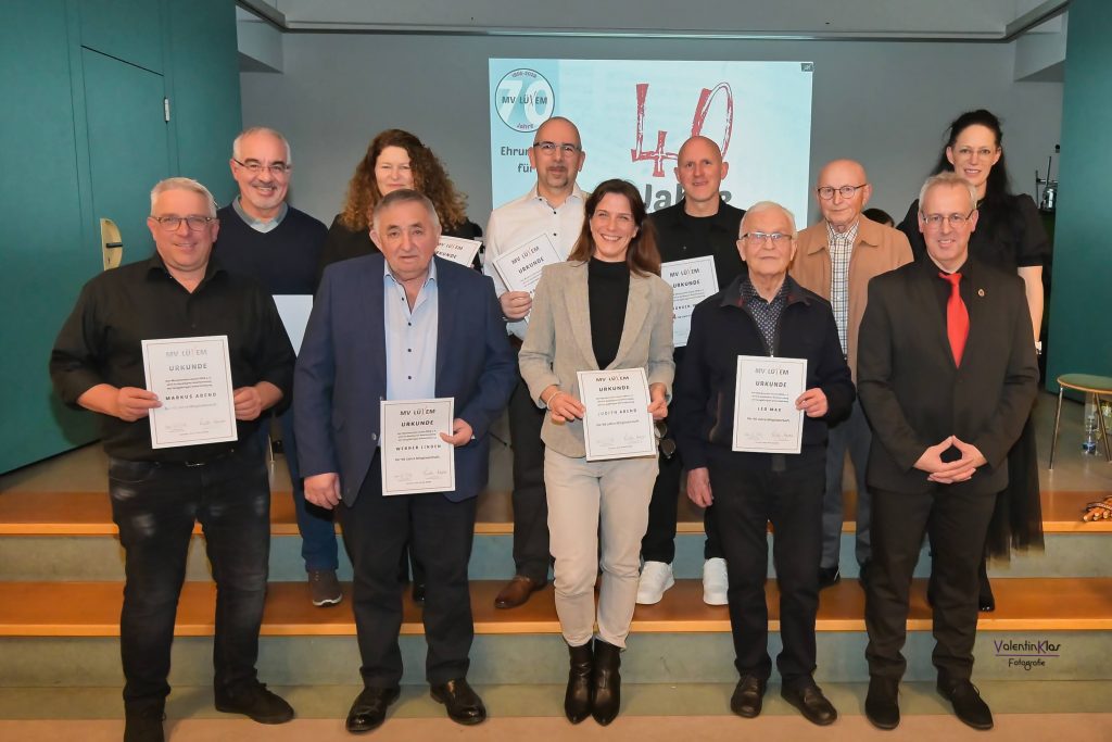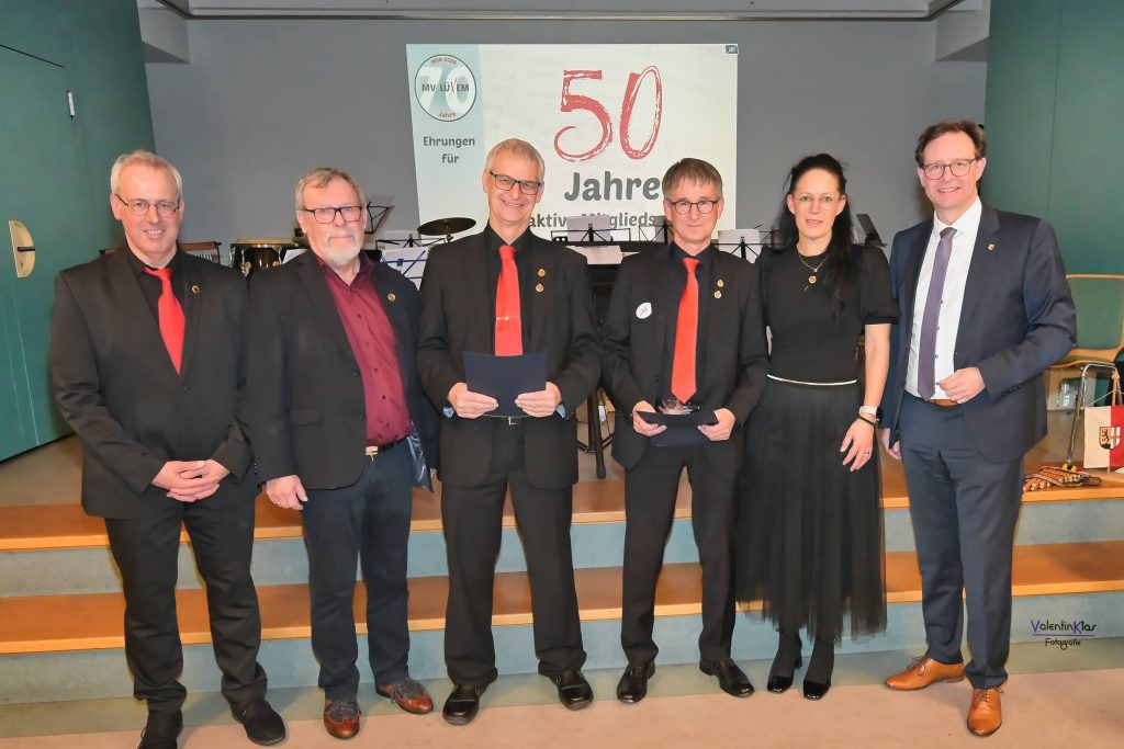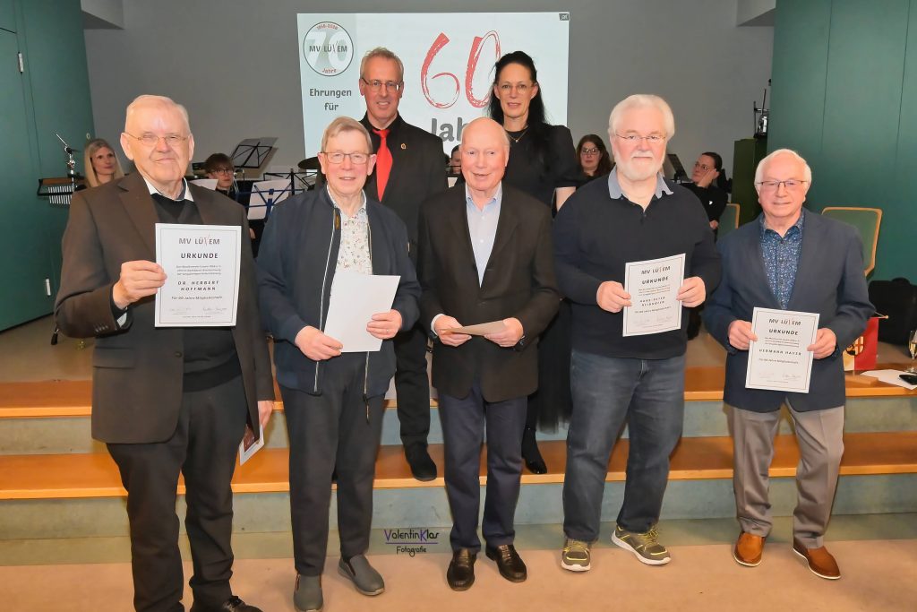 Ebenso beeindruckend waren die Auszeichnungen für jahrzehntelanges aktives Musizieren, darunter Ehrenmitglied Albert Bollig für 60 Jahre, Wilfried Caspari und Ernst Schmitt für jeweils 50 Jahre (Landesehrenbrief mit Ehrenzeichen Gold) sowie zahlreiche Musikerinnen und Musiker für 40 und 30 Jahre ((Ehrenzeichen Gold), 20 Jahre (Ehrenzeichen Silber), 10 Jahre (Ehrenzeichen Bronze) und 5 Jahre (Jugendehrennadel Silber) aktives Wirken.