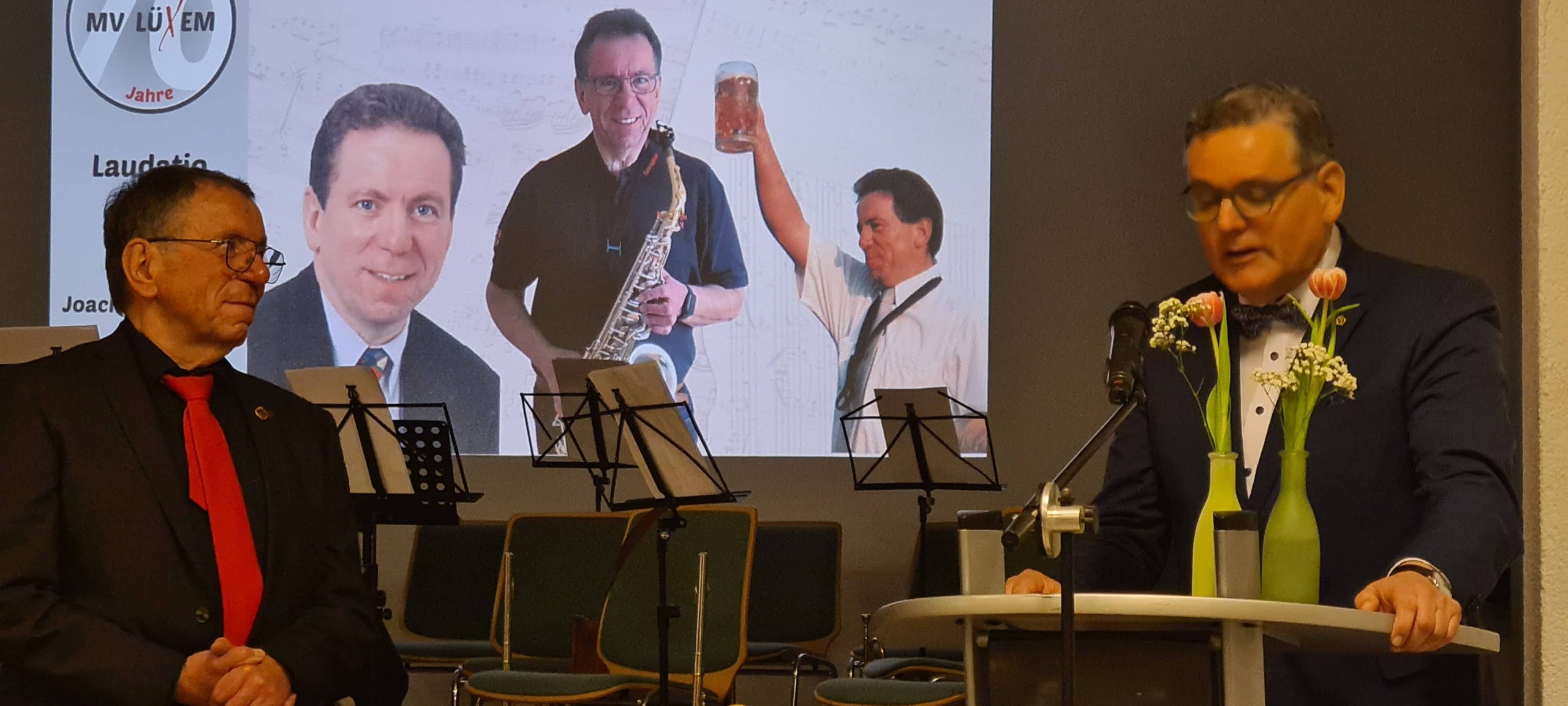 Stephan von St. Vith nahm die Gäste mit auf eine kurzweilige Reise durch sieben Jahrzehnte Vereinsgeschichte. Ausgehend von den Wurzeln im Jahr 1928 – als Lehrer Karl Mayer ein Streichquartett gründete – spannte er den Bogen zur Neugründung 1956 im Gasthaus Pekart‑Ertz. Mit einem Augenzwinkern erinnerte er an die erste „Crowdfunding‑Aktion“ des Dorfes, als 20 Lüxemer jeweils 200 DM spendeten, um die ersten Instrumente zu finanzieren. „Der Saal war voll, und alle hatten Lust auf Musik“, so in etwa musste die damalige Stimmung gewesen sein.
