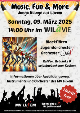 Als Dirigentin konnte Susanne Ambrosius, Musiklehrerin aus Lüxem, gewonnen werden. Sie versteht es zusammen mit den Jugendlichen interessante Literatur auszuwählen, die schnell eingeprobt ist und somit schnelle Erfolge zeigt. Ein erster Auftritt der Formation war beim Sommerfest Lukesinga 2024 in Lüxem. So proben die Musikerinnen und Musiker von DeLüx regelmäßig alle zwei Wochen freitags im Probenraum der alten Schule in Lüxem, der auch nach der Probe noch die Möglichkeit bietet, gesellig zu verweilen.